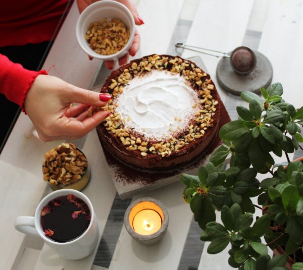 Én a torta szélét díszítettem kakaó porral, durvára vágott sós mogyoróval és dióval. 🙂